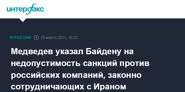 Москва. 10 марта. INTERFAX.RU - Президент России Дмитрий Медведев на встрече с вице-президентом США Джозефом Байденом заявил о недопустимости применения односторонних санкций против российских компаний.