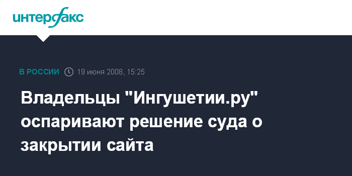 Москва. 19 июня. INTERFAX.Ru - Представители сайта "Ингушентия.ру" подали кассационную жалобу на решение Кунцевского суда Москвы о прекращении деятельности интернет-ресурса.