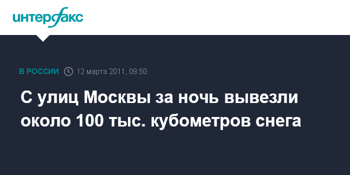 Москва. 12 марта. INTERFAX.RU - В пятницу вечером на улицы города было выведено около 10 тыс. единиц снегоуборочной техники, сообщил "Интерфаксу" в субботу пресс-секретарь заместителя мэра по вопросам ЖКХ и благоустройства Игорь Пергаменщик. "На снегосплавные пункты вывезено около 100 тыс. кубометров снега", - сказал И.Пергаменщик.