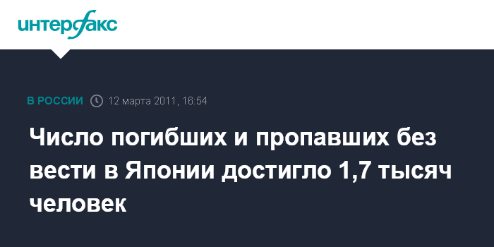 Токио. 12 марта. INTERFAX.RU - Не менее 1,7 тыс. человек числятся погибшими или пропавшими без вести после землетрясения и цунами, обрушившихся на страну в минувшую пятницу, заявил на пресс-конференции в субботу генсек кабинета министров Японии Юкио Эдано. "Это было крупнейшее землетрясение со времен эпохи Мейдзи, возможно, погибли более 1 тыс. человек", - заявил он, выступая в штаб по ликвидации последствий стихийного бедствия.