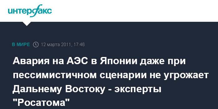 Москва. 12 марта. INTERFAX.RU - Авария на АЭС "Фукусима-Дайичи", которая стала следствием разрушительного землетрясения в Японии, не несет угроз населению российского Дальнего Востока, даже если реализуется самый плохой из возможных сценариев, считают эксперты оперативного штаба "Росатома".