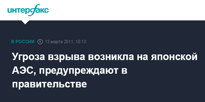 Лондон. 13 марта. INTERFAX.RU - Правительство Японии предупредило в воскресенье о риске взрыва на АЭС "Фукусима-1", сообщает телерадиокорпорация Би-Би-Си. Представитель кабинета министров пояснил, что угроза взрыва в реакторе номер три возникла из-за скопившегося в нем водорода. Вместе с тем, в правительстве полагают, что специалистам удастся найти выход из сложившейся на АЭС, пострадавшей от сильного землетрясения, опасной ситуации.
