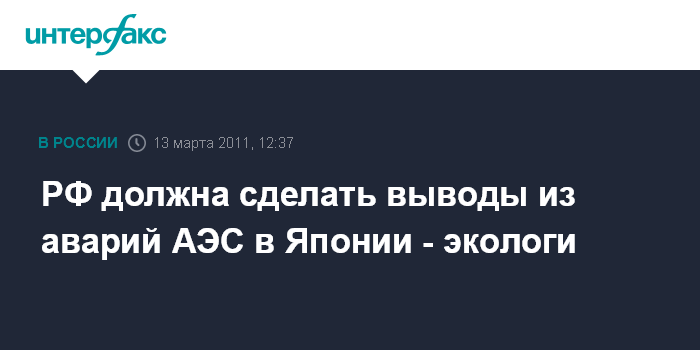 Москва. 13 марта. INTERFAX.RU - Аварии на АЭС в Японии после землетрясения и цунами подтвердили опасность, которую представляет атомная энергетика, заявляют экологи.