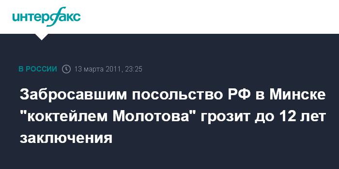 Забросавшим посольство РФ в Минске "коктейлем Молотова" грозит до 12 лет заключения