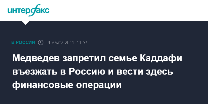 Этим же указом запрещен въезд на территорию и транзит через Россию лидеру ливийской революции Муамару Каддафи, его высокопоставленному окружению и родственникам.