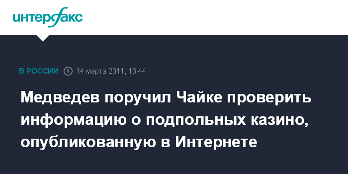 Горки. 14 марта. INTERFAX.RU - Президент РФ Дмитрий Медведев поручил генеральному прокурору Юрию Чайке проверить существование нелегальных казино по адресам, указанным на сайте "Где казино".