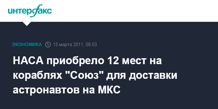 Вашингтон. 15 марта. INTERFAX.RU - Национальное аэрокосмическое агентство США в понедельник объявило о заключении контракта с Роскосмосом по покупке за $753 млн двенадцати мест на российских пилотируемых кораблях "Союз" для доставки астронавтов на Международную космическую станцию (МКС) и возвращения с нее в период с 2014 года по июнь 2016 года.