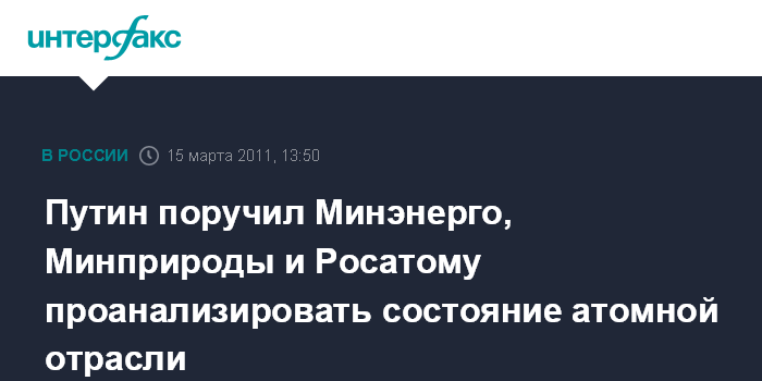 Ново-Огарево. 15 марта. INTERFAX.RU - Премьер-министр России Владимир Путин поручил Минэнерго, Минприроды и "Росатому" провести анализ состояния атомной отрасли и оценить перспективы ее развития.