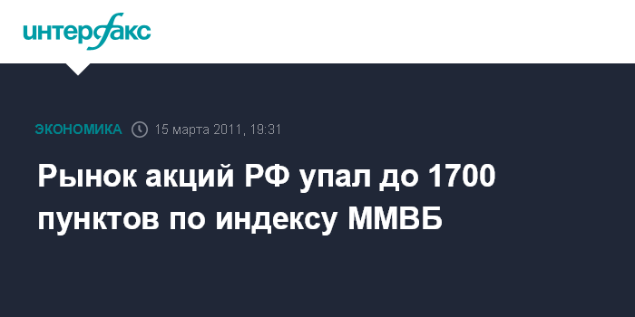 Москва. 15 марта. INTERFAX.RU - Российский рынок акций во вторник упал до 1700 пунктов по индексу ММВБ на фоне отката мировых фондовых площадок во главе с Японией из-за разрастания масштабов бедствия в стране после землетрясения, объем торгов на ММВБ достиг рекорда с конца октября 2009 года, составив 106,95 млрд рублей.