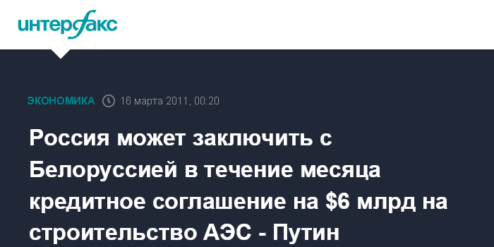 Минск. 16 марта. ИНТЕРФАКС - Премьер-министр РФ Владимир Путин заявил, что Россия в течение месяца может подписать с Белоруссией кредит соглашение на $6 млрд на строительство АЭС.