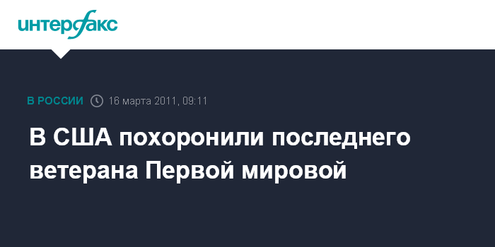Лондон. 16 марта. INTERFAX.RU - Фрэнк Баклс, последний американский ветеран Первой мировой войны, был похоронен со всеми военными почестями на Арлингтонском национальном кладбище.