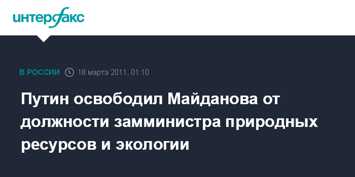 Москва. 18 марта. ИНТЕРФАКС - Председатель правительства РФ Владимир Путин своим распоряжением освободил Игоря Майданова от должности заместителя министра природных ресурсов и экологии России.