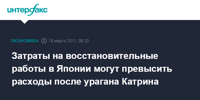 Нью-Йорк. 18 марта. INTERFAX.RU - Затраты на восстановительные работы в Японии могут достигнуть $150 млрд, что превышает запланированные расходы США, связанные с восстановлением после урагана "Катрина", ожидает промышленная компания 3M Co.