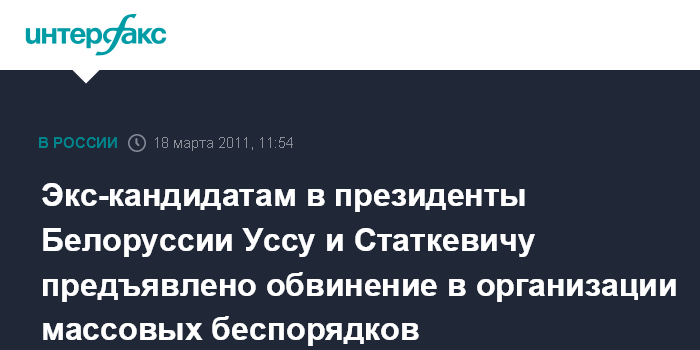 Минск. 18 марта. INTERFAX.RU - Белорусское следствие предъявило обвинение в организации массовых беспорядков еще двум экс-кандидатам в президенты Белоруссии Николаю Статкевичу и Дмитрию Уссу, сообщил агентству "Интерфакс" временно исполняющий обязанности начальника управления информации и общественных связей МВД Белоруссии Константин Шалькевич.