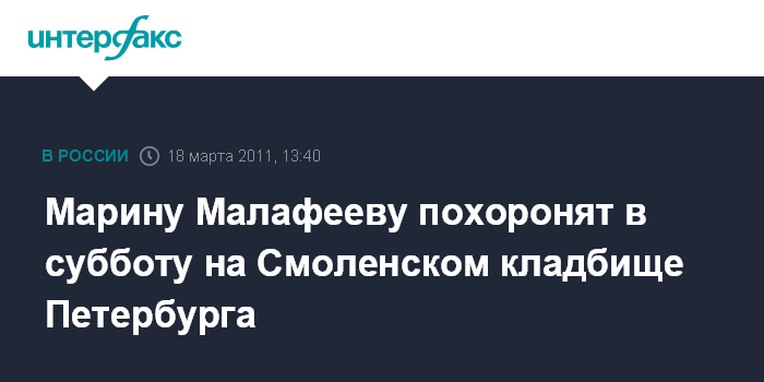 Санкт-Петербург. 18 марта. ИНТЕРФАКС СЕВЕРО-ЗАПАД - Похороны жены голкипера петербургского "Зенита" и сборной России по футболу Вячеслава Малафеева Марины, погибшей в ДТП, состоятся в субботу на Смоленском кладбище северной столицы.
