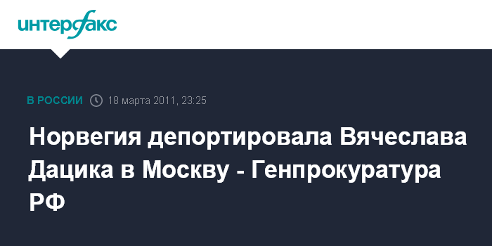Москва. 18 марта. ИНТЕРФАКС - Норвегия депортировала в пятницу вечером в Россию Вячеслава Дацика, который обвиняется у себя на родине в совершении разбоя.