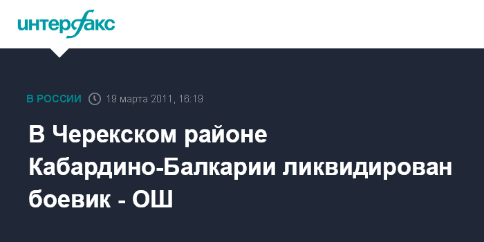 Нальчик. 19 марта. INTERFAX.RU - В Кабардино-Балкарии в субботу был ликвидирован боевик, сообщает Оперативный штаб в КБР. Около 10:00 мск в субботу в поселке Кашхатау Черекского района сотрудниками правоохранительных органов проводилась операция по задержанию активного участника бандподполья - ранее судимого местного жителя, 1980 г. рождения, говорится в сообщении. Боевик оказал вооруженное сопротивление и ответным огнем был нейтрализован.
