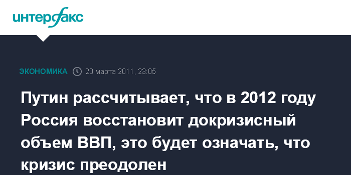 Путин рассчитывает, что в 2012 году Россия восстановит докризисный объем ВВП, это будет означать, что кризис преодолен