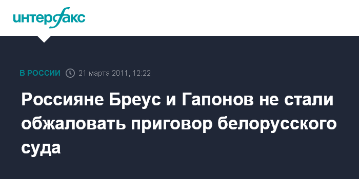 Минск. 21 марта. INTERFAX.RU - Срок подачи кассационной жалобы на приговор, вынесенный белорусским судом российским гражданам Артему Бреусу и Ивану Гапонову за участие в массовых беспорядках 19 декабря 2010, истек в понедельник.