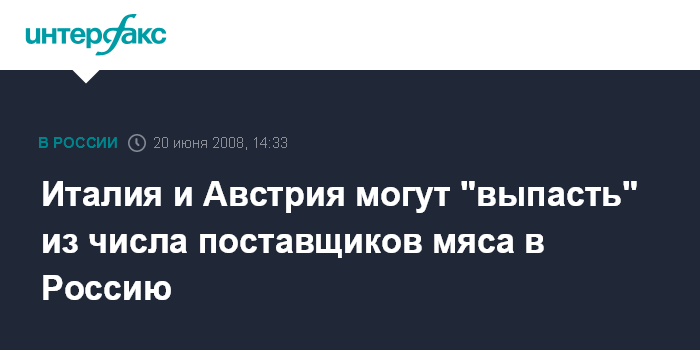 Москва. 20 июня. INTERFAX.RU - Италия и Австрия с первого июля могут "выпасть" из числа поставщиков мяса и мясопродукции в Россию, заявил руководитель Россельхознадзора Сергей Данкверт.