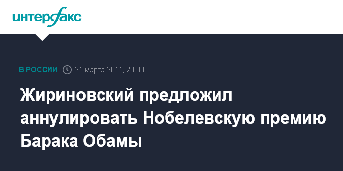 Москва. 21 марта. INTERFAX.RU - Вице-спикер Госдумы, лидер ЛДПР Владимир Жириновский обратился в Нобелевский комитет с просьбой лишить президента США Барака Обаму присужденной в 2009 году премии мира.