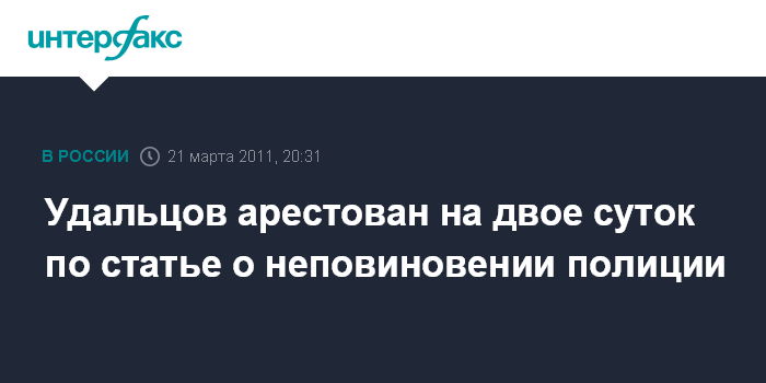 Москва. 21 марта. INTERFAX.RU - Координатор "Левого фронта" Сергей Удальцов, задержанный в минувшее воскресенье на митинге против роста цен на бензин, заявляет, что суд приговорил его к двум суткам ареста за неповиновение полиции.