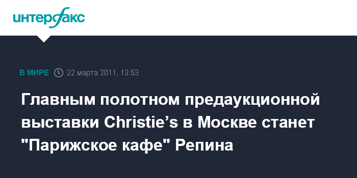 Москва. 22 марта. INTERFAX.RU - Картина Ильи Репина "Парижское кафе", написанная в 1875 году и ранее никогда не выставлявшаяся в России, будет главным полотном ежегодного предаукционного показа в Москве.Это монументальное полотно, находящееся в выдающейся частной коллекции начиная с 1916 года, считается одним из наиболее значимых произведений художника, не входящих в музейные собрания.