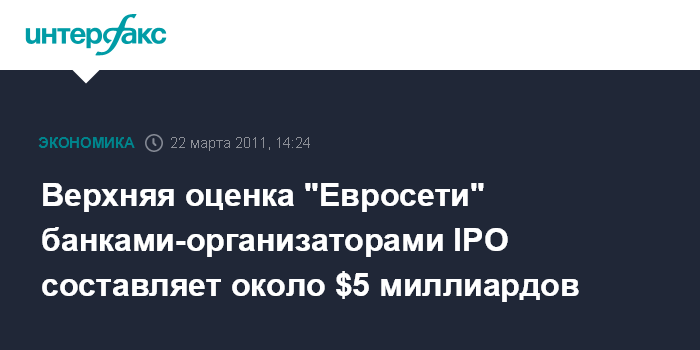 Москва. 22 марта. INTERFAX.RU - Верхний предел оценки капитализации "Евросети" банками-организаторами IPO составляет около $5 млрд, сообщил агентству "Интерфакс" источник в банковских кругах.