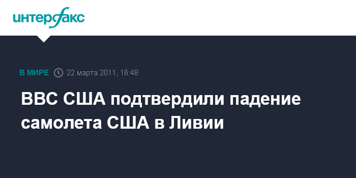 Лондон. 22 марта. INTERFAX.RU - Представитель американского военного командования подтвердил факт крушения самолета ВВС США в Ливии, передает во вторник телерадиокорпорация BBC.