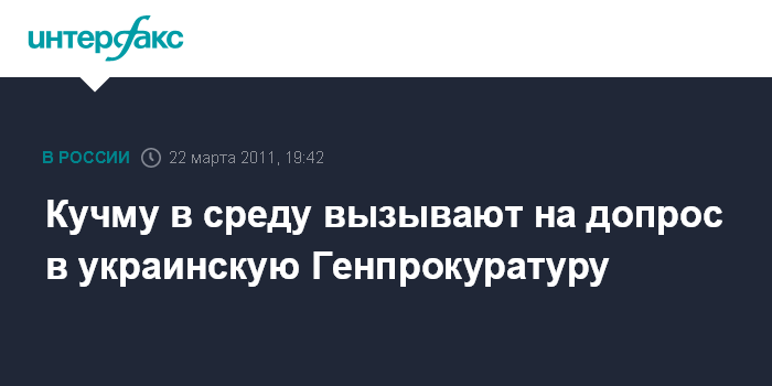 Киев. 22 марта. INTERFAX.RU - Второго президента Украины Леонида Кучму (1994-2004 гг) в среду в 10:00 вызывают на допрос в Главное следственное управление Генеральной прокуратуры, сообщил агентству "Интерфакс-Украина" информированный источник.