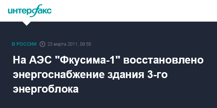 Москва. 23 марта. INTERFAX.RU - Восстановлено электроснабжение здания третьего энергоблока АЭС "Фукусима-1", передает телекомпания NHK. Со ссылкой на энергетическую компанию ТЕРСО сообщается, что в здании появился свет, и сотрудники могут проводить работу по мониторингу уровня воды в реакторе и отслеживать состояние хранилища с отработанным ядерным топливом.