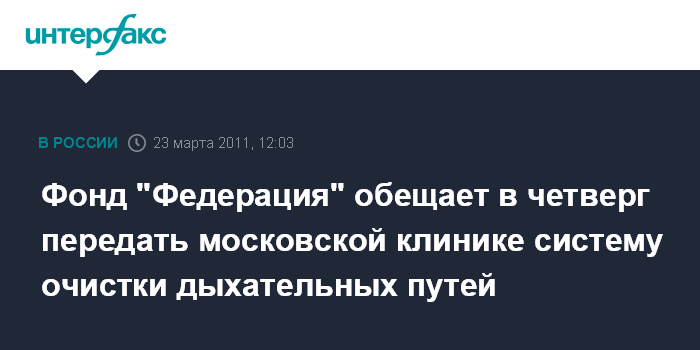 Фонд "Федерация" обещает в четверг передать московской клинике систему очистки дыхательных путей