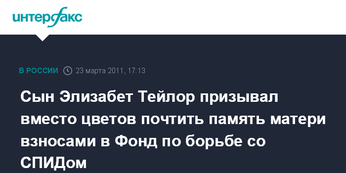 Москва. 23 марта. INTERFAX.RU – Сын Элизабет Тейлор, скончавшейся в Лос-Анджелесе, призвал всех поклонников звезды почтить ее память не отправкой цветов, а пожертвованиями в Фонд Элизабет Тейлор по борьбе со СПИДом. Он также попросил уважать личную жизнь семьи, указав, что все соболезнования можно будет оставить на странице в Facebook. В настоящий момент стена созданной страницы полна писем – люди соболезнуют, говорят спасибо. "Элизабет Тейлор добавляла красоты в нашу жизнь", - говорится в одном из сообщений.
