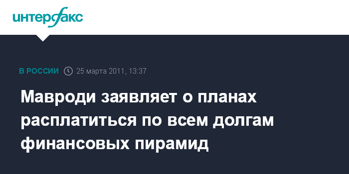 Москва. 25 марта. INTERFAX.RU - Основатель финансовой пирамиды МММ-2011 Сергей Мавроди в своем Интернет-блоге заявил о планах расплатиться со всеми пострадавшими участниками им же созданной пирамиды МММ-1994, а также с жертвами других старых пирамид и даже с держателями вкладов в Сбербанке СССР. Делать он это собирается "посредством механизма, аналогичного МММ-2011".