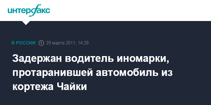 Москва. 25 марта. INTERFAX.RU - Сотрудники полиции задержали водителя "Ауди-ТТ", которая в пятницу днем в центре Москвы протаранила милицейскую машину, сопровождавшую служебный автомобиль генерального прокурора Юрия Чайки.