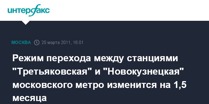 Режим перехода между станциями "Третьяковская" и "Новокузнецкая" московского метро изменится на 1,5 месяца