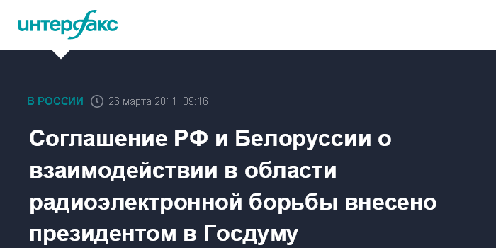 Москва. 26 марта. ИНТЕРФАКС - Президент РФ Дмитрий Медведев внес в Госдуму на ратификацию соглашение между Российской Федерацией и Белоруссией о взаимодействии в области радиоэлектронной борьбы, сообщает в субботу пресс-служба главы государства.