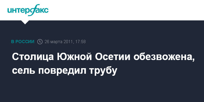 Цхинвали. 26 марта. INTERFAX.RU - В результате аварии на магистральном водопроводе Едис - Цхинвали столица Южной Осетии осталась без воды. Гендиректор ГУП "Энергоресурс - Южная Осетия" Алан Габараев сообщил "Интерфаксу" в субботу, что авария произошла в Дзауском районе республики. "На 6 километре Транскама по течению реки Лиахва сошел сель, в результате чего труба получила серьезное повреждение. Пять метров трубы подлежат замене", - сказал А.Габараев.