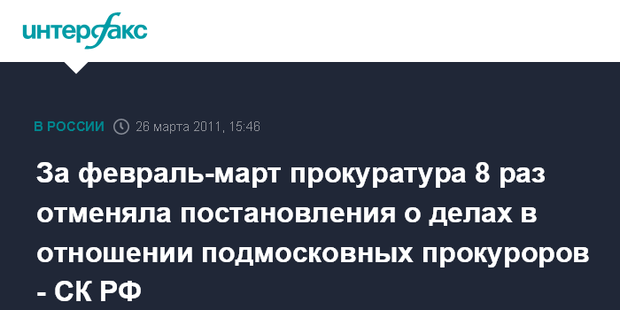 Москва. 26 марта. INTERFAX.RU - За последние два месяца прокуратура вынесла восемь постановлений об отмене уголовных дел, где в качестве подозреваемых фигурировали высокопоставленные сотрудники подмосковной прокуратуры. "Только за февраль-март текущего года прокуратурой было вынесено восемь постановлений об отмене уголовных дел, где фигурантами, в том числе и в качестве подозреваемых являлись высокопоставленные работники подмосковной прокуратуры", - сообщил "Интерфаксу" официальный представитель Следственного комитета России Владимир Маркин.