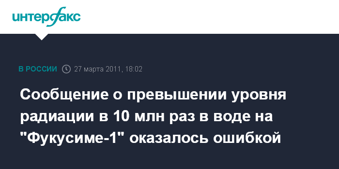 Лондон. 27 марта. INTERFAX.RU - Японская энергетическая компания ТЕРСО опровергла распространенное ранее сообщение о превышении уровня радиации в 10 млн раз в воде второго реактора АЭС "Фукусима-1", передает в воскресенье британская телерадиокорпорация Би-би-си. В TEPCO заявили, что специалисты компании ошиблись с расчетами при определении уровня радиации во втором энергоблоке аварийной АЭС. По информации Би-би-си, несмотря на опровержение, уровень радиационного излучения в районе АЭС остается очень высоким.