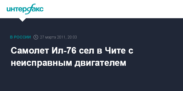 Чита. 27 марта. ИНТЕРФАКС-СИБИРЬ - Самолет Ил-76 совершил посадку с неисправным двигателем в аэропорту Читы, сообщили агентству "Интерфакс-Сибирь" в ГУ МЧС по Забайкальскому краю.