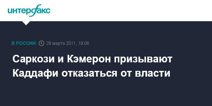 Париж. 28 марта. INTERFAX.RU - Президент Франции Николя Саркози и премьер-министр Великобритании Дэвид Кэмерон призывали ливийского лидера Муамара Каддафи как можно быстрее отказаться от власти.
