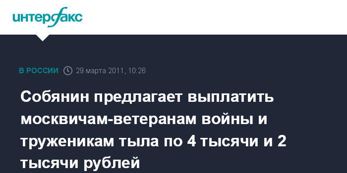 Собянин предлагает выплатить москвичам-ветеранам войны и труженикам тыла по 4 тысячи и 2 тысячи рублей