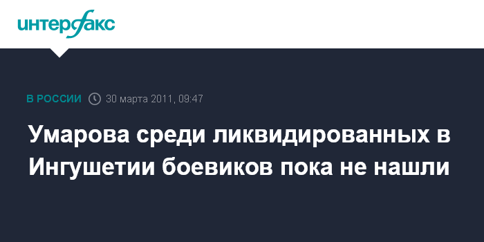 Москва. 30 марта. INTERFAX.RU - Лидера северокавказских боевиков Доку Умарова пока не обнаружили среди боевиков, уничтоженных в ходе спецоперации в Ингушетии, сообщил "Интерфаксу" в телефонном интервью в среду глава Ингушетии Юнус-Бек Евкуров. "По уничтожению Умарова - пока подтверждения нет", - сказал он.