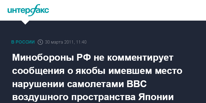 Москва. 30 марта. INTERFAX.RU - Российское военное ведомство воздерживается от комментариев по поводу заявлений о якобы произошедшем нарушении самолетами ВВС РФ воздушного пространства Японии на прошлой неделе.