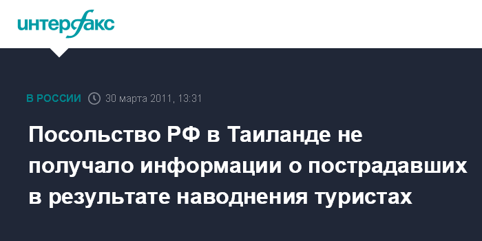 Бангкок. 30 марта. INTERFAX.RU - Информация о том, что в результате затопления из-за дождей на трех островах Таиланда - Самуи, Тао, Пханган пострадал кто-либо из российских туристов, не поступала.