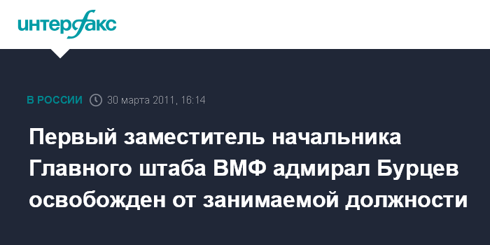 Москва. 30 марта. INTERFAX.RU - Президент России Дмитрий Медведев освободил от занимаемой должности первого заместителя начальника Главного штаба Военно-Морского Флота вице-адмирала Олега Бурцева, сообщает в среду сайт Кремля.