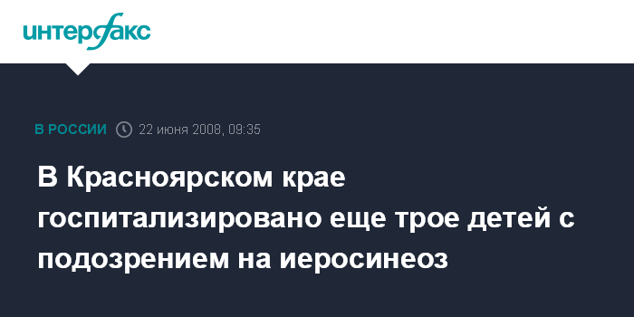Красноярск. 22 июня. ИНТЕРФАКС-СИБИРЬ - Еще три ребенка госпитализированы с подозрением на иеросинеоз из оздоровительного лагеря "Солнечный" под Красноярском.
