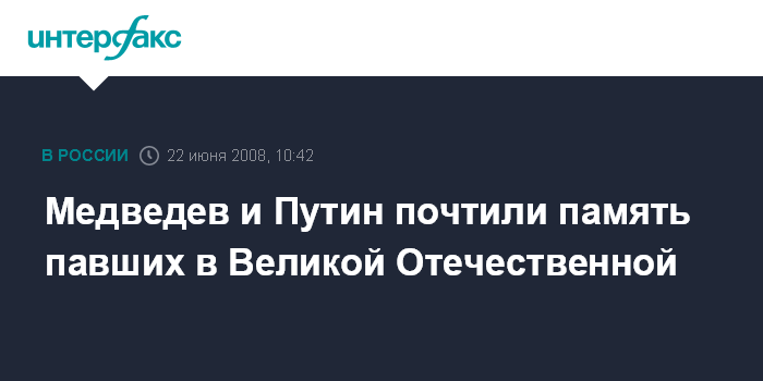 Москва. 22 июня. ИНТЕРФАКС - Президент России Дмитрий Медведев в День памяти и скорби, 22 июня, возложил венок к могиле Неизвестного солдата у Кремлевской стены, почтив память павших в Великой Отечественной войне.
