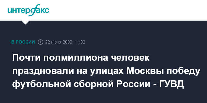 Москва. 22 июня. ИНТЕРФАКС-МОСКВА - Минувшей ночью на площади и улицы Москвы праздновать победу футбольной сборной России над командой Голландии вышли почти 500 тыс. человек, сообщил "Интерфаксу" начальник управления информации и общественных связей ГУВД Москвы Виктор Бирюков.